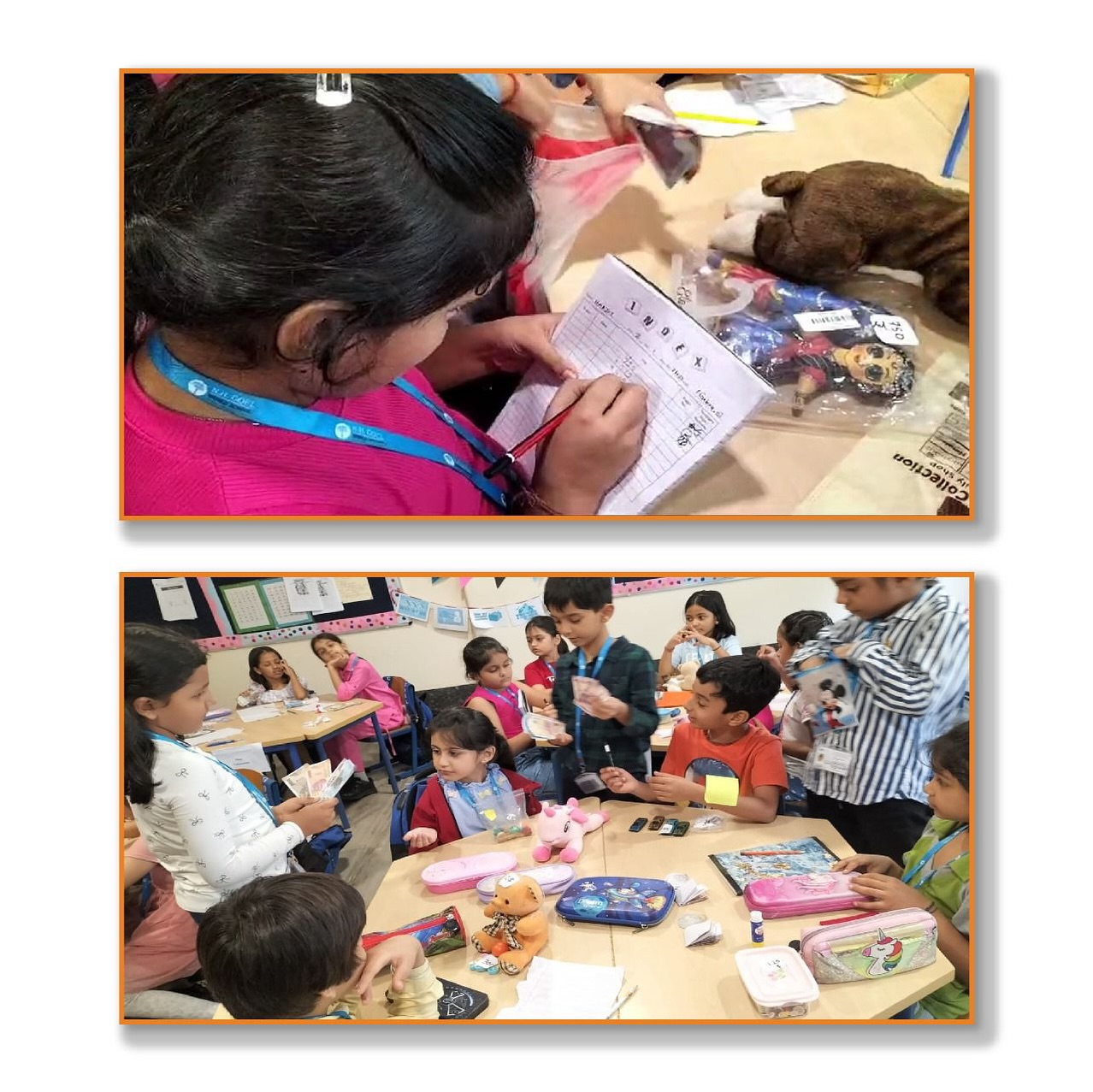 Market Activity in Maths was done in Group for grade 2i . Unique store names was given to each group. The activity included 1 team as a Buyer and other team as a seller at a time. All the toys/objects were priced in Indian / US currencies and kept for sale in the stores. Different tasks done in the activity includes : Sellers team used Addition concept while making bill. Buyer used Money Concept to pay the bill amount in decimal.And lastly the Seller uses Subtraction concept to give the return amount.