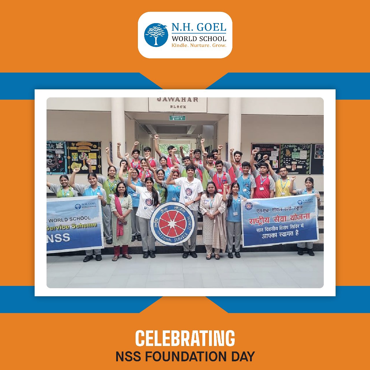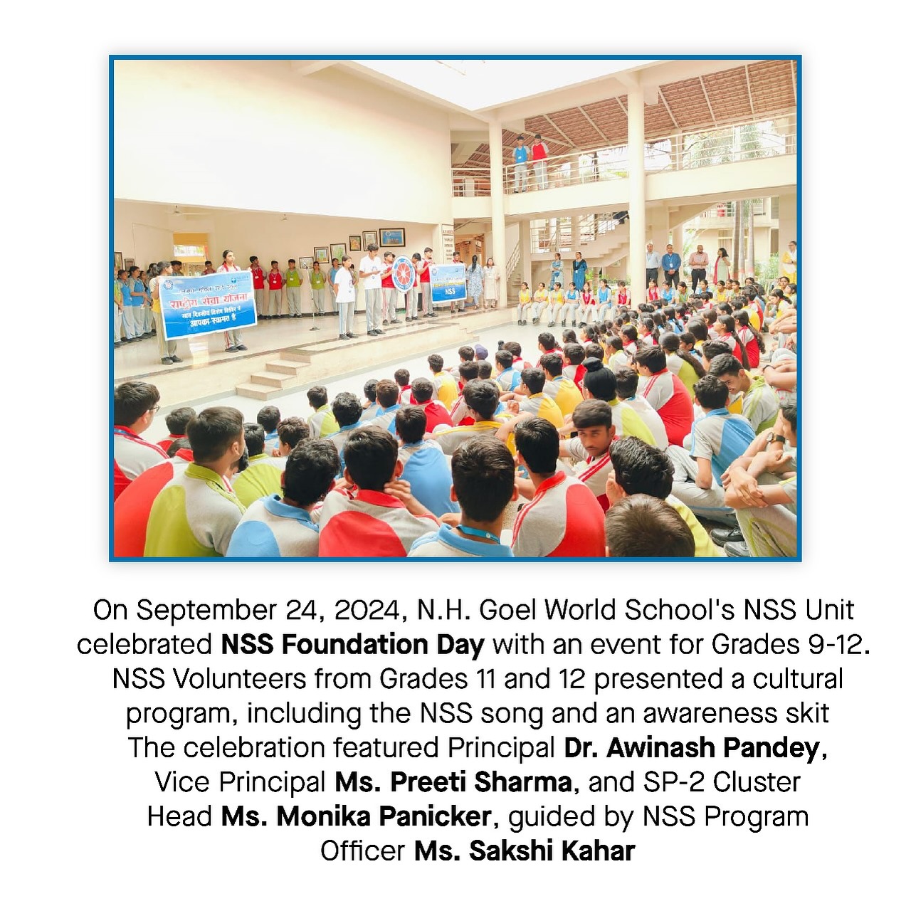 National Service Scheme Unit of N.H.Goel World School celebrated NSS Foundation Day on 24th September 2024. NSS Volunteers of Grade 11&12 organised a special celebration with an audience of students of grade 9-12 of CBSE and IGCSE. NSS song, Patriotism through culture and a skit with awareness campaign was part of the celebration. The celebration was graced by Principal- Dr. Awinash Pandey sir, Vice Principal- Ms. Preeti Sharma madam, SP-2 Cluster Head- Ms. Monika Panicker. The celebration was organised under the guidance of NSS Program Officer- Ms. Sakshi Kahar and was supported by all NSS Volunteers.